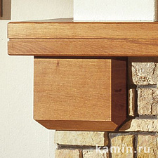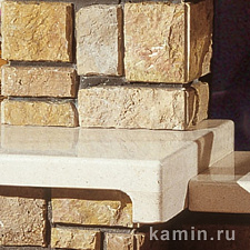 Облицовка изготовлена из желтого кварцита, верхняя и нижняя панели выполнены из белого полированного мрамора. Полки выполнены из осветленной сосны.